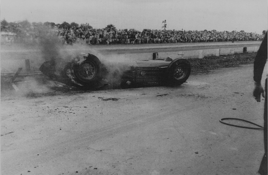 Looking North, the Vukovich car has come to a rest upside down with flames engulfing the rear of the car.