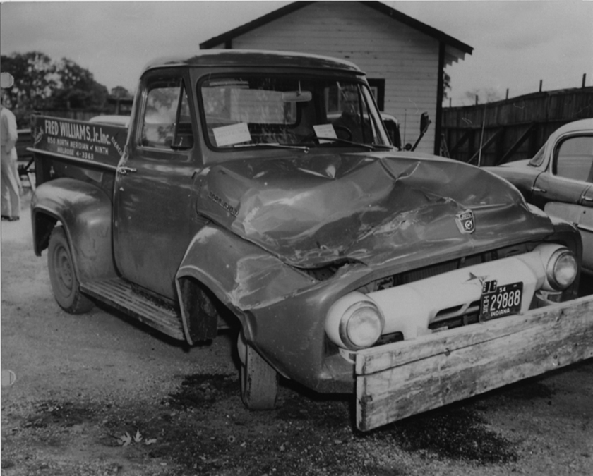 74 Damaged Pickup IMS Photo Published October 8, 2011 at 840 × 675 in The Accident: Photos The damaged Ford pickup truck hit by Vukovich’s tumbling car.